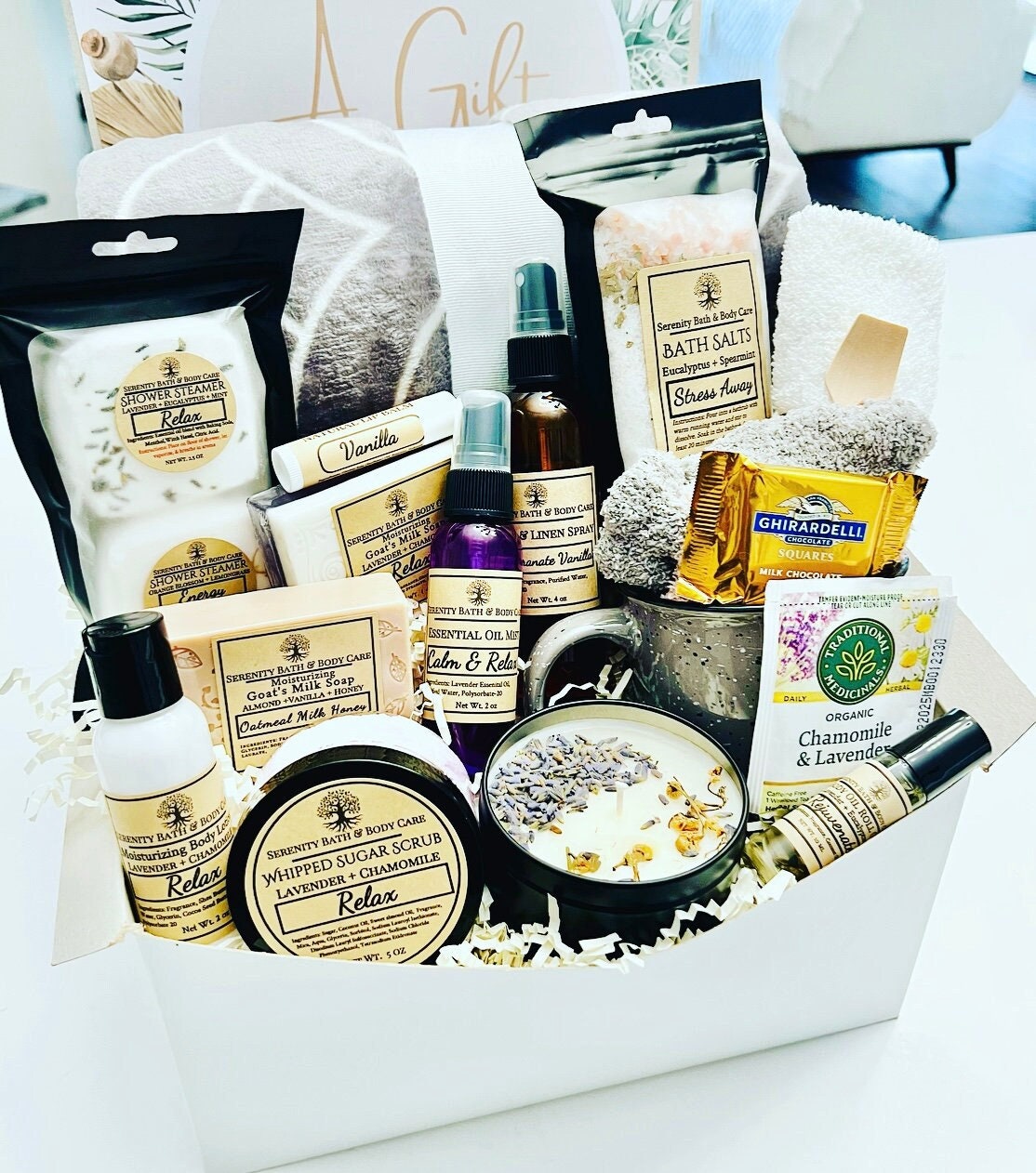 Our luxurious relaxation gift boxes feature quality bath and body care products that helps promotes stress relief, relaxation and self-care. Send a spa gift basket today to brighten up someone's day with thoughtful items. Our relax care packages will arrive nicely packed.
