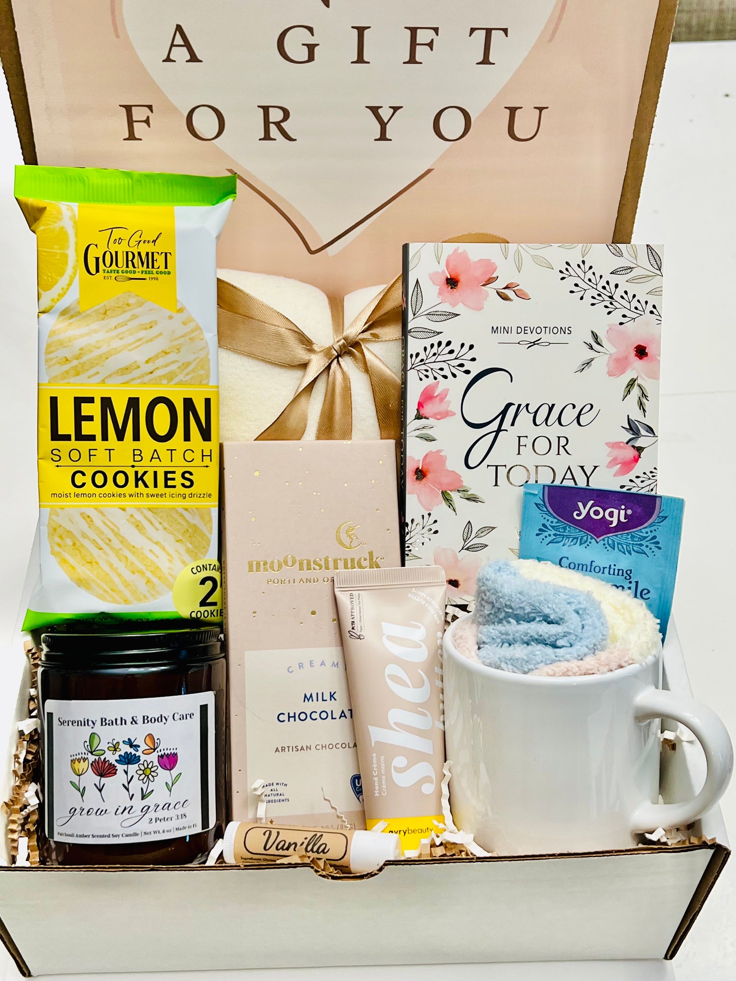 This devotional gift box includes Grace for Today Mini Devotions, comforting chamomile tea, artisan chocolate, lemon cookies, a “Grow in Grace” candle, cozy socks in a mug, shea hand cream, and vanilla lip balm — all packaged with love and ready to encourage her heart.