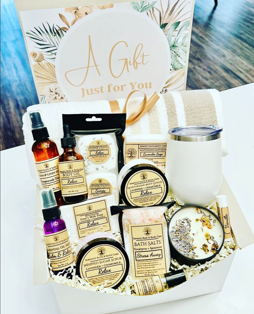Our Relaxation Spa Gift Boxes are perfect gifts to send for a friend, co-worker, loved one or as a self-care gift for yourself. Our products are handcrafted in small batches with natural ingredients. Our Luxurious spa gift sets features bath and body care products that helps promotes stress relief and relaxation.